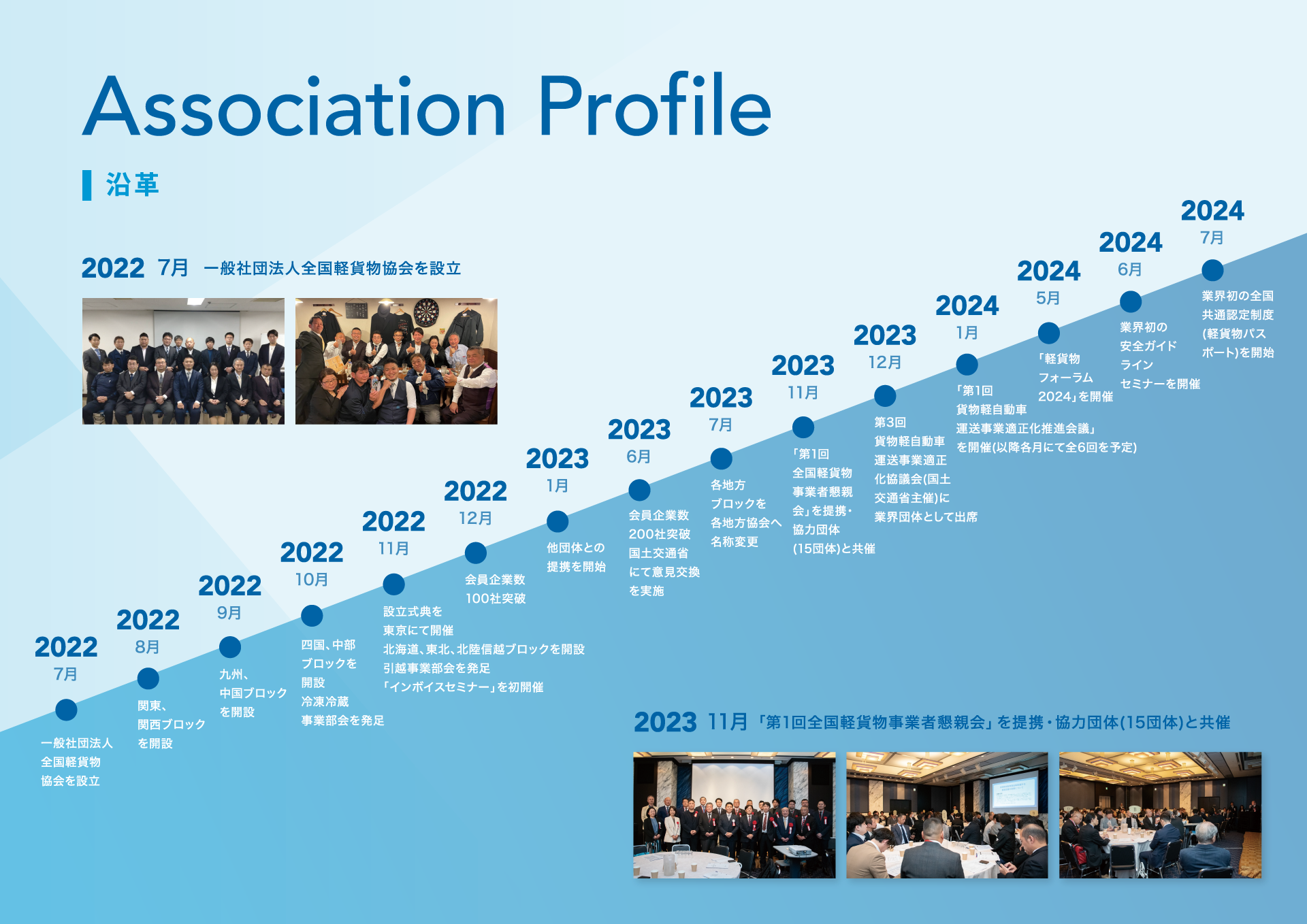 | 2022年 | 一般社団法人全国軽貨物協会 設立 「関東、関西ブロック」開設 「九州、中国ブロック」開設 「四国、中部ブロック」開設 「冷凍冷蔵部会」を発足 設立式典を東京にて開催 北海道、東北、北陸信越ブロックを開設 引越し事業部会を発足「インボイスセミナー」を初開催 会員企業数100社突破 |
